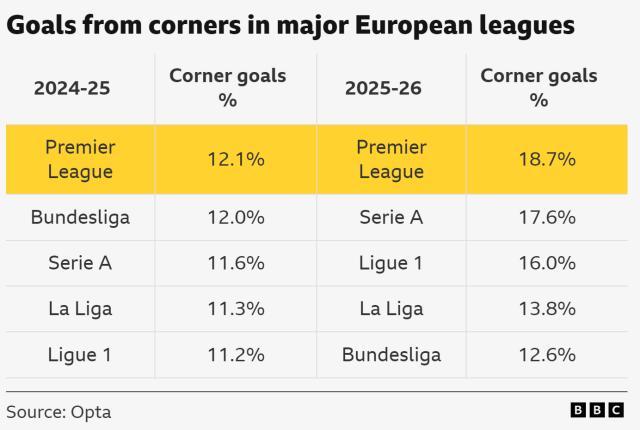 這個趨勢不僅存在于英超,五大聯(lián)賽的角球破門占比都比前一賽季有了提高。英超是從12.1%提升為18.7%,德甲和意甲也有類似的明顯漲幅,西甲和法甲的漲幅則低出不少(下表)。